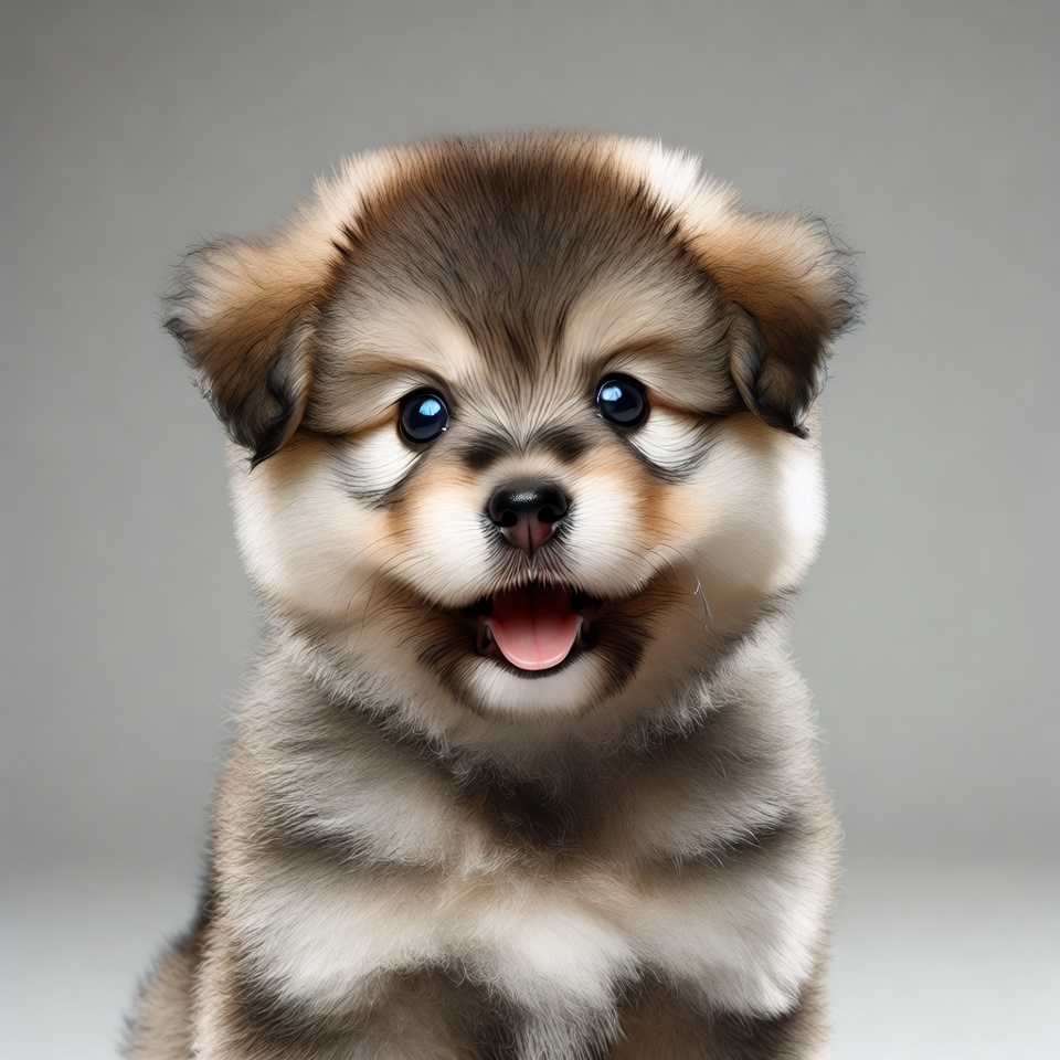 A young husky puppy with fluffy brown and white fur sits on a gray background. It has bright blue eyes and an open mouth showing its tongue in a happy expression. The fur is detailed and soft-looking around its face and paws.