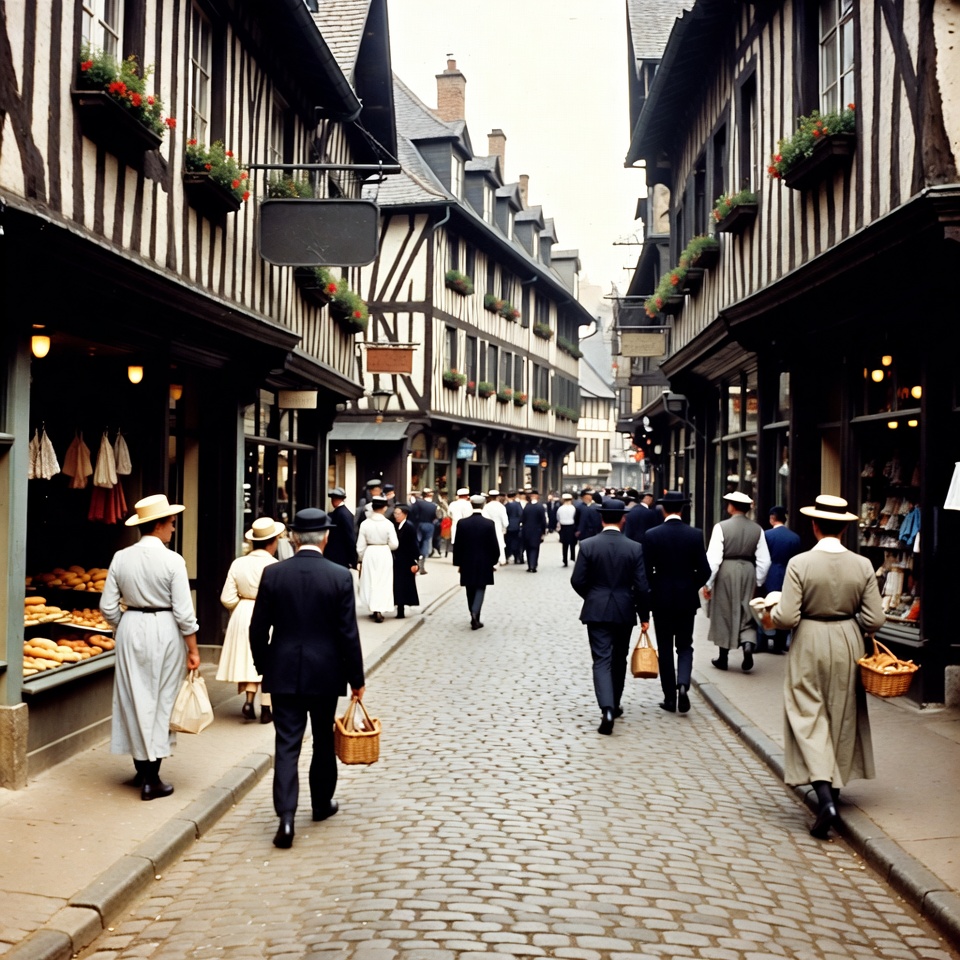 1920s fashion, baskets, black white architecture, cobblestone path, early 1900s, european village, flower boxes, france street, hats, historic buildings, long dresses, market street, men, narrow alley, normandy architecture, old town, pedestrians, period clothing, shops, suits, tudor street, vintage lamps, vintage people, walking street, women, half-timbered buildings
