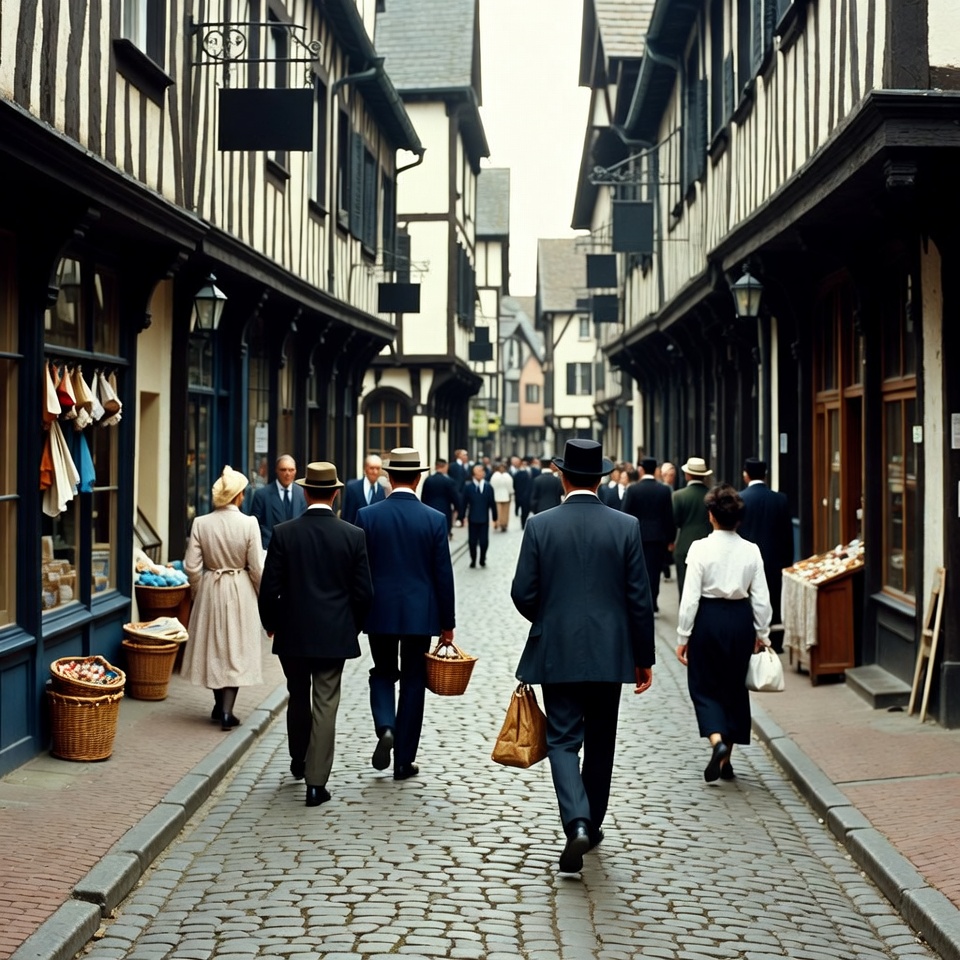 1950s fashion, architecture, baskets, black white buildings, cobblestone alley, crowd, dresses, european village, fedoras, handbags, hats, historical, market stalls, men, narrow street, old town, overcast sky, pedestrians, people walking, shops, street scene, suits, tudor architecture, vintage clothing, women, half-timbered buildings