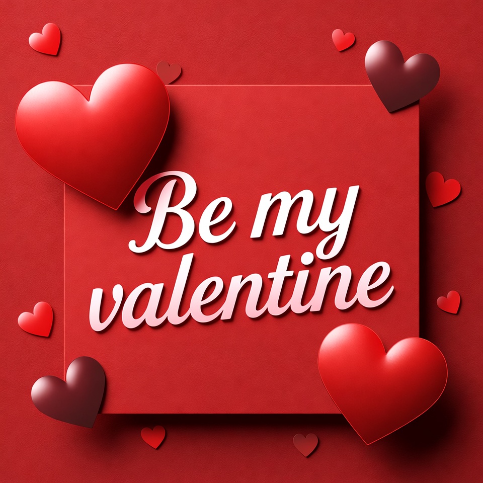 3D hearts, Be my Valentine, Valentine background, Valentine card, Valentine greeting, digital art, festive hearts, floating hearts, glossy hearts, graphic design, heart illustration, hearts graphic, love hearts, love message, love text, red background, red hearts, red square, romantic design, Valentine's Day