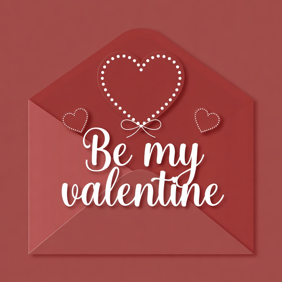 A red envelope illustration features the text 'Be my Valentine' in elegant white script. A large white-outlined heart sits atop the open envelope, with smaller hearts and a bow on the flap. The design is set against a solid red background.