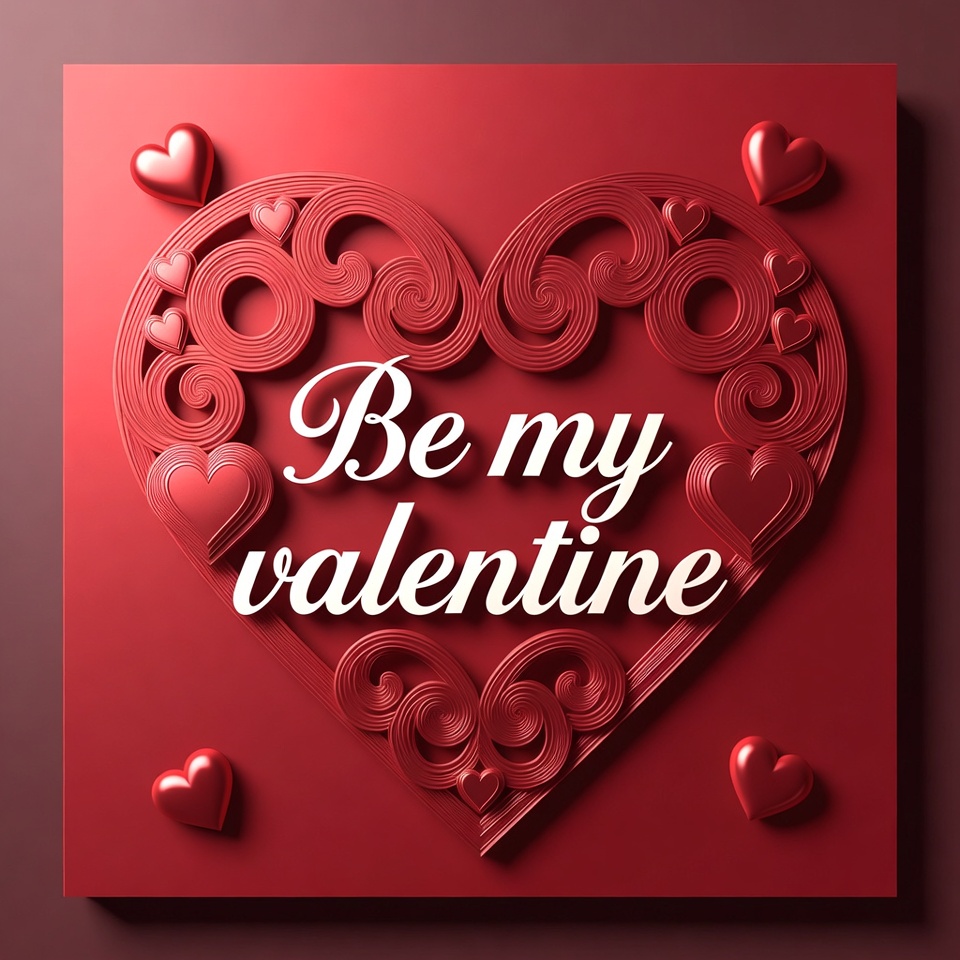 A 3D rendered red heart with intricate swirling cutout designs features the text 'Be my Valentine' in elegant white script. Surrounding the central heart are additional small red hearts on a solid maroon background. The design has a glossy, embossed appearance typical of digital Valentine's Day artwork.