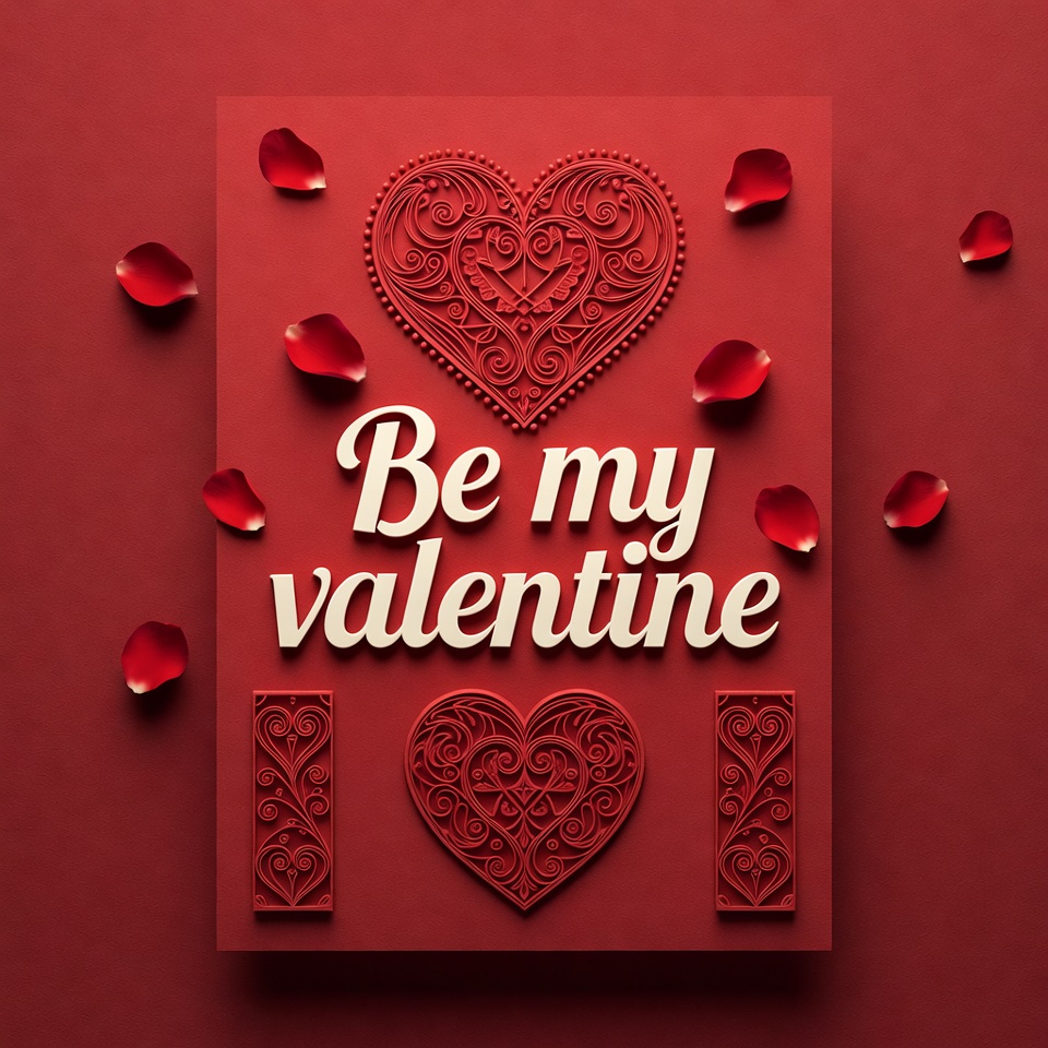 A vibrant red background features ornate embossed hearts with intricate floral patterns. White elegant text reads 'Be my Valentine' surrounded by scattered red rose petals. Additional carved heart designs frame the composition.