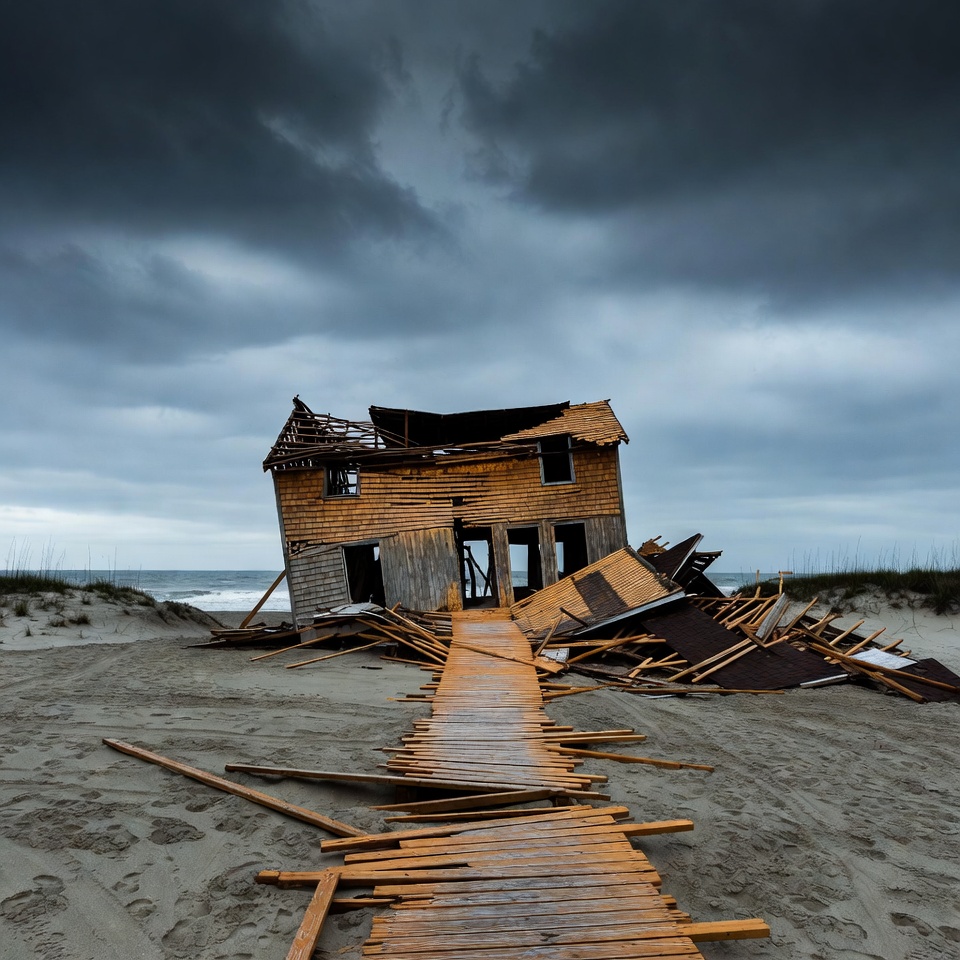 beach house, boardwalk, coastal ruin, dark clouds, debris, dilapidated building, driftwood, isolated background, ocean waves, ruined house, sandy beach, seashore, stormy sky, wooden house, wrecked structure, abandoned house