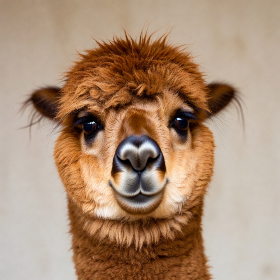 A fluffy alpaca with reddish-brown fur stares directly at the camera with large, expressive dark eyes. Its soft muzzle features a distinctive pink nose and gentle smile. The animal is centered against a plain beige background.