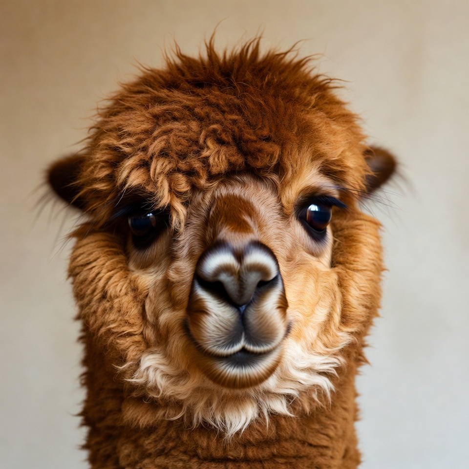 A fluffy alpaca with thick reddish-brown fur stares directly at the camera with large dark eyes. Its muzzle features a pink nose and white accents around the mouth. The animal is centered against a plain beige background.