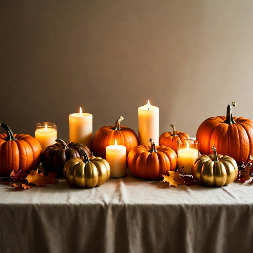 Halloween, Jack-o-lanterns, Thanksgiving, autumn leaves, beige tablecloth, candles, fall decor, festive arrangement, gold pumpkins, lit candles, neutral background, orange pumpkins, pillar candles, table display, votive candles, warm lighting, pumpkins
