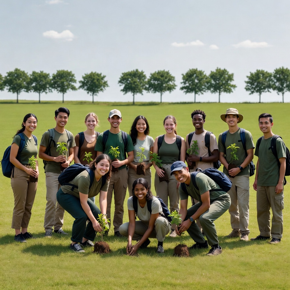 African-American, Asian, Multiracial, White, backpacks, cloudy sky, digging soil, diverse group, environmental, female, grassy field, green shirts, khaki pants, male, nature conservation, outdoor activity, saplings, smiling, teamwork, tree planting, trees background, volunteers, young adults, group planting trees