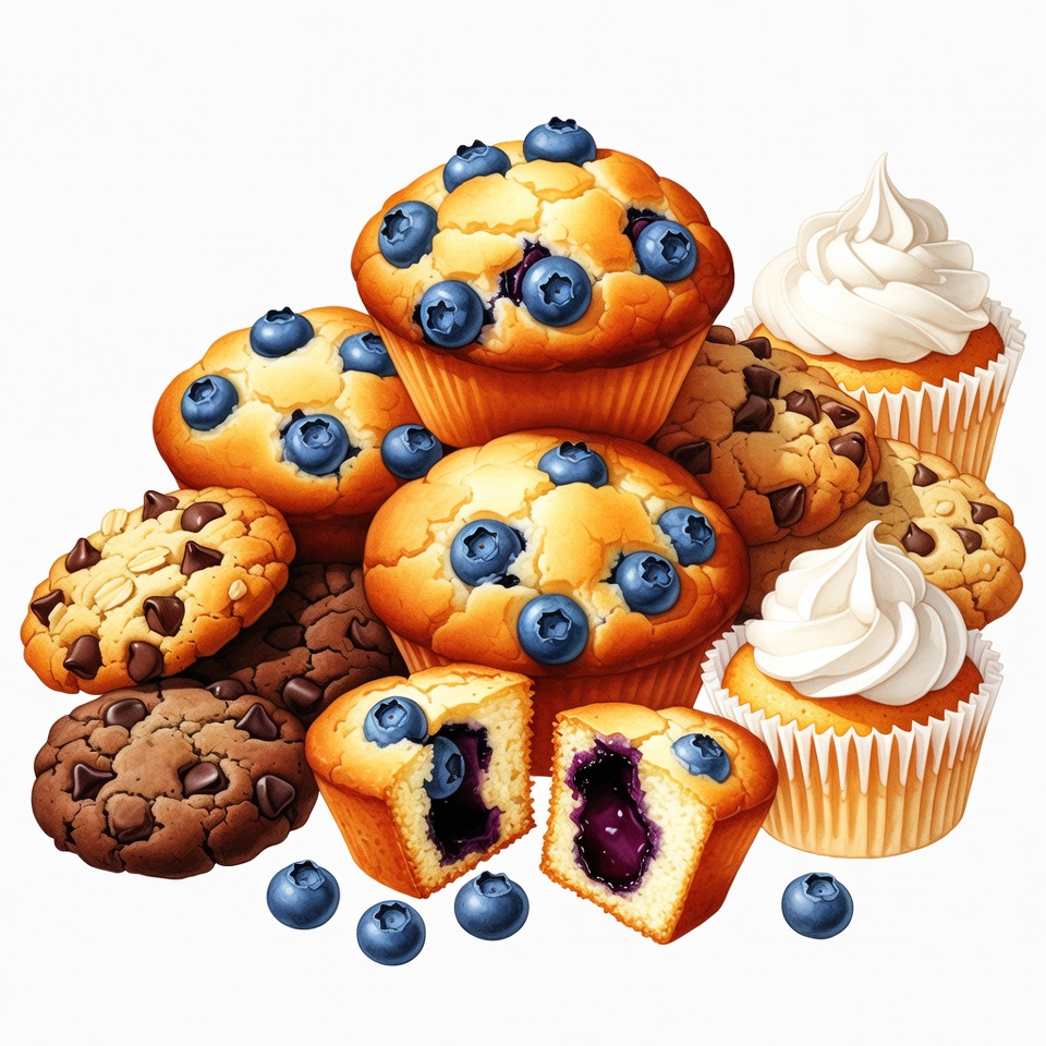 baked goods, berries, blueberries, blueberry muffins, breakfast, chips, chocolate chip muffins, clipart, closeup, delicious, dessert, food, fresh, golden, illustration, isolated background, pastry, pile, snack, stack, vibrant, whipped cream, muffins