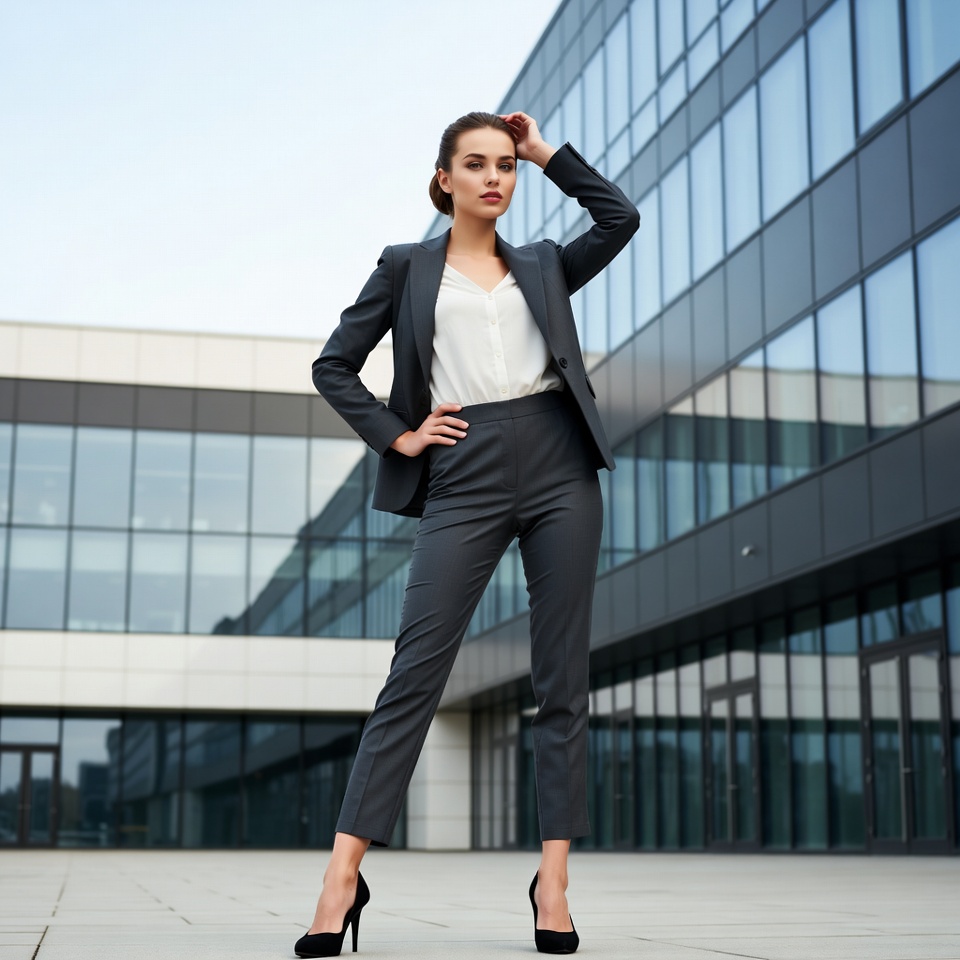 A young woman with brunette hair in an updo stands confidently on a paved area in front of a large glass office building. She wears a gray tailored suit with a white blouse, hands on hips, and high heels. Her pose is professional and poised against the blue sky and reflective windows.