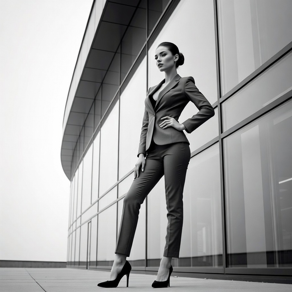 White, black and white, business suit, cityscape, concrete platform, confident stance, curved facade, dark hair, elegant, fashion pose, female, glass building, hand on hip, high heels, modern architecture, monochrome, office attire, pose, professional, sophisticated woman, stylish outfit, tailored suit, updo hairstyle, urban background, woman