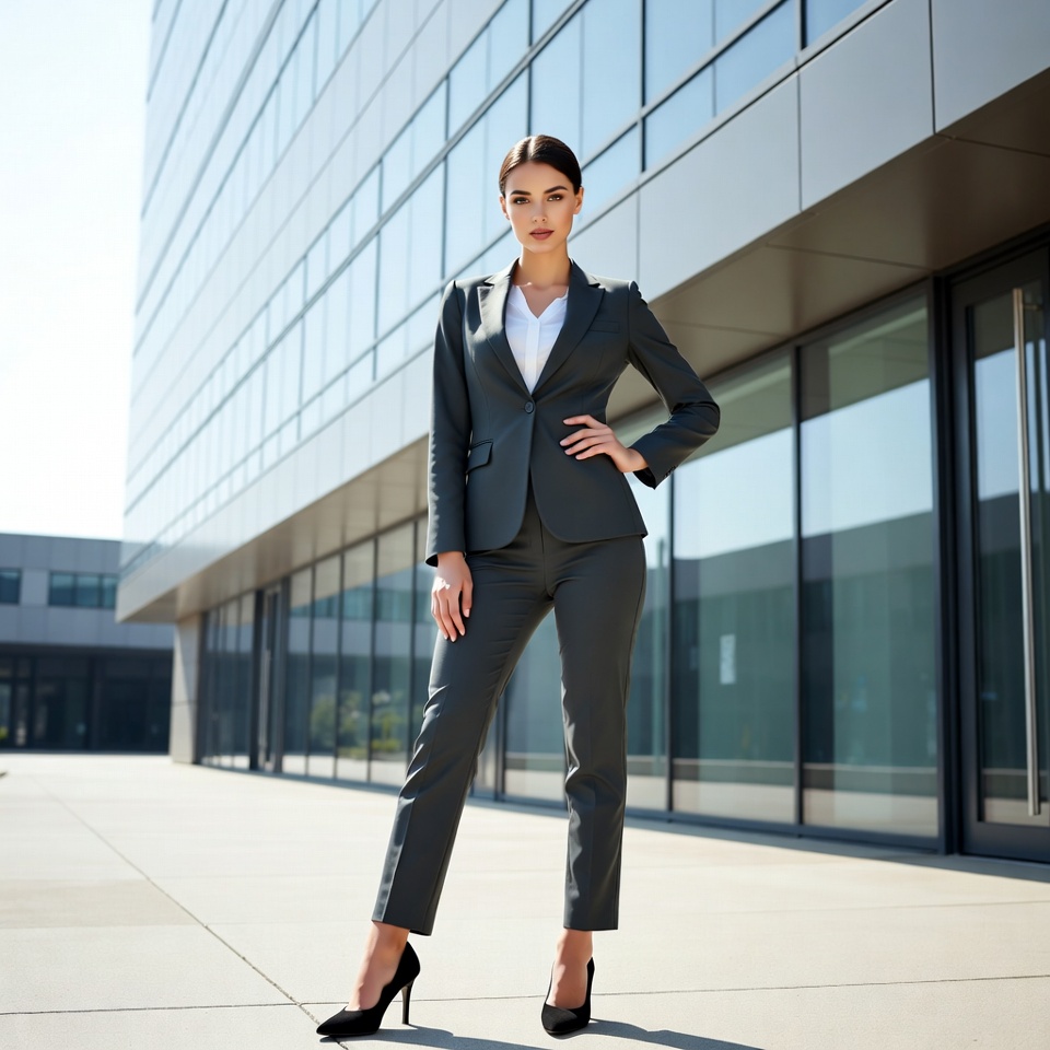 A young woman with dark brunette hair stands confidently on a paved area in front of a modern glass skyscraper building. She wears a tailored gray pantsuit with a white blouse and black high heels, with one hand on her hip. The sunny day highlights the reflective windows of the tall office building behind her.