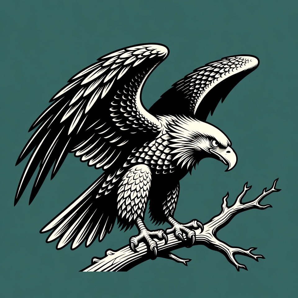 animal, beak, bird, black white, branch, detailed feathers, eagle, engraving style, feathers, fierce eagle, illustration, isolated background, line art, perched, raptor, soaring eagle, talons, tree branch, vector art, wildlife, wings, bald eagle