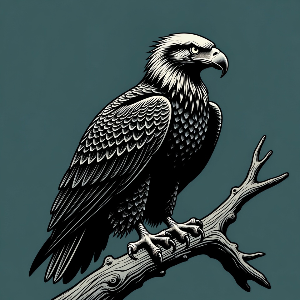A detailed black and white illustration of a bald eagle perched on a tree branch. The eagle features sharp talons gripping the branch, intense eyes, and intricately detailed feathers. It is set against a solid teal background.