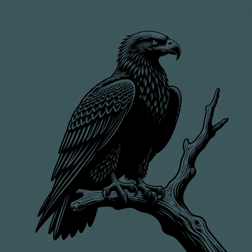A detailed black line art illustration of an eagle perched on a wooden branch. The eagle faces right with sharp talons gripping the branch and detailed feathers covering its body. The image is set against a solid dark teal background.