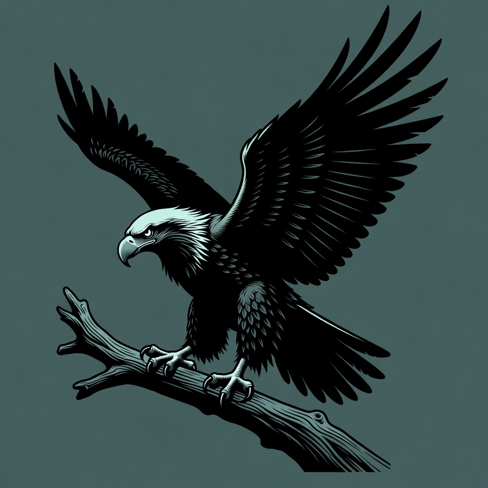 A detailed black and white illustration of a bald eagle perched on a wooden branch with wings partially spread. The eagle has a fierce expression with a white head, yellow beak, and dark feathers. It stands against a dark teal background.
