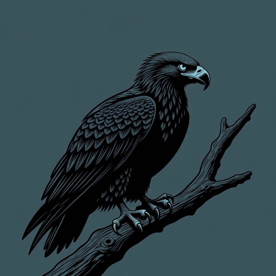 A detailed black illustration of an eagle perched on a wooden branch against a dark blue background. The eagle faces right with sharp talons gripping the branch and intricate feather patterns visible on its body and wings. The style is line art with subtle shading.
