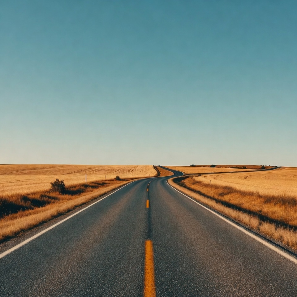 agriculture, asphalt road, blue sky, bushes, clear sky, countryside, dry grass, empty road, farmland, fields, golden fields, harvest fields, horizon, landscape, nature, outdoor, plain, prairie, rural road, scenic road, straight road, wheat fields, winding road, yellow line, road