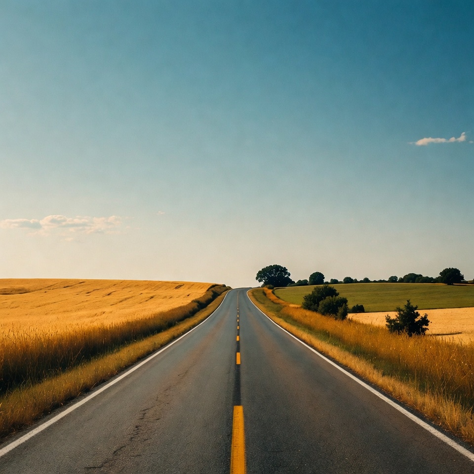agriculture, asphalt road, blue sky, country road, countryside, empty road, farmland, fields, golden wheat, grass, harvest, horizon, landscape, nature, outdoors, pathway, rural road, scenic road, shrubs, straight road, summer, trees, wheat fields, yellow line, road