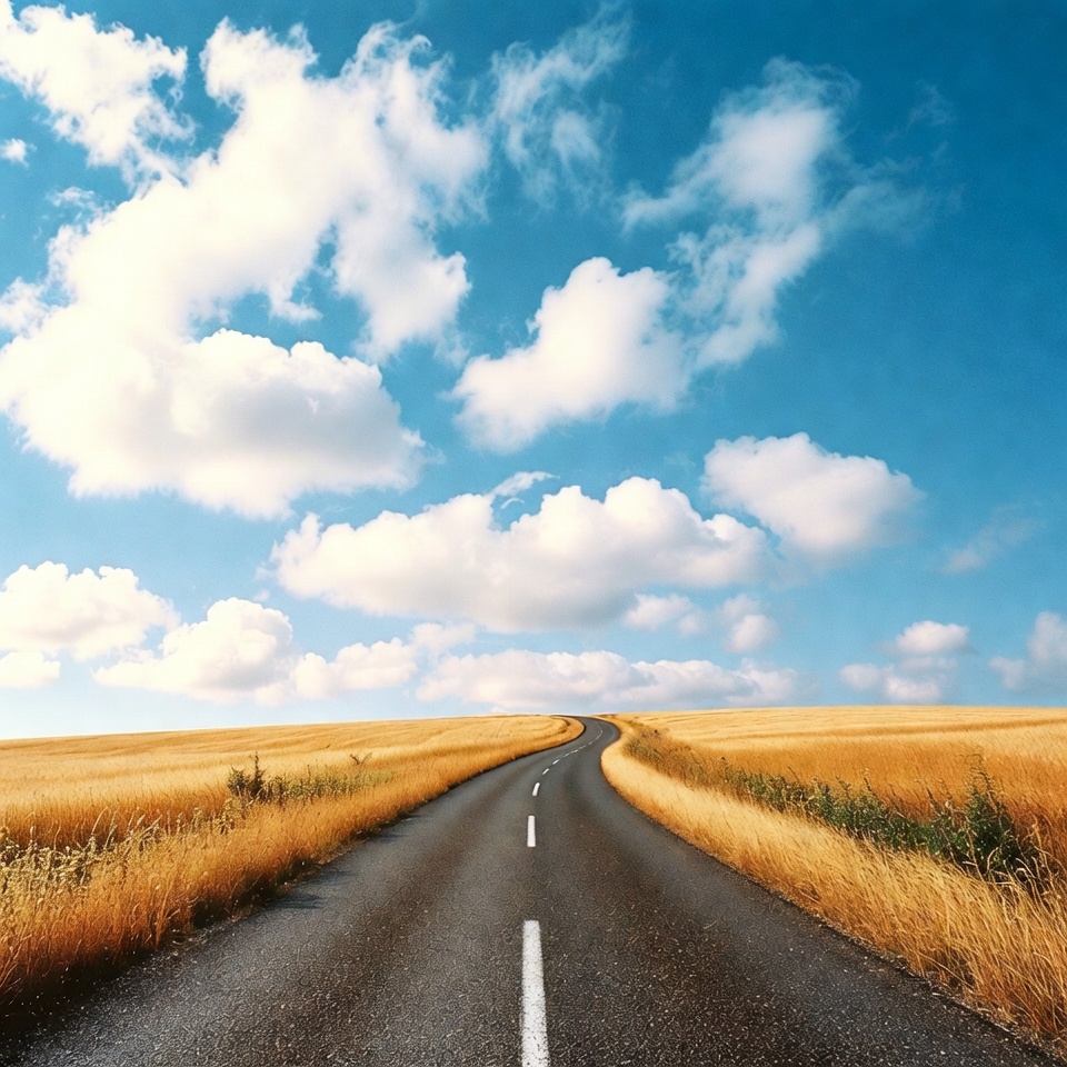 A long, curving asphalt road stretches through a vast golden wheat field under a bright blue sky. Fluffy white clouds dot the sky above the expansive horizon. The road leads toward the distant vanishing point amid the ripe wheat crops.