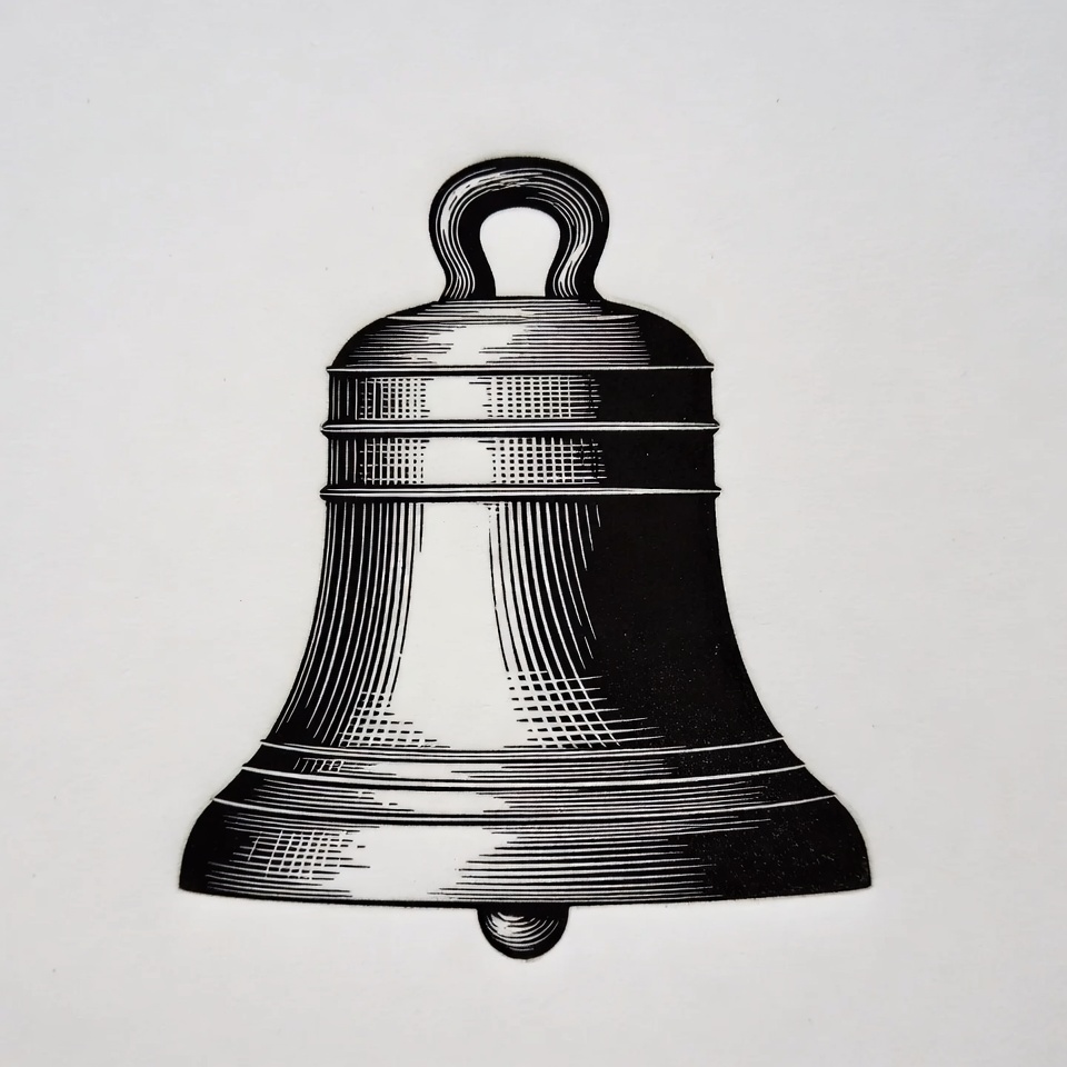 A detailed black and white line drawing of a classic bell with a handle on top. The bell features intricate engravings and shading for depth. It is isolated on a white background.