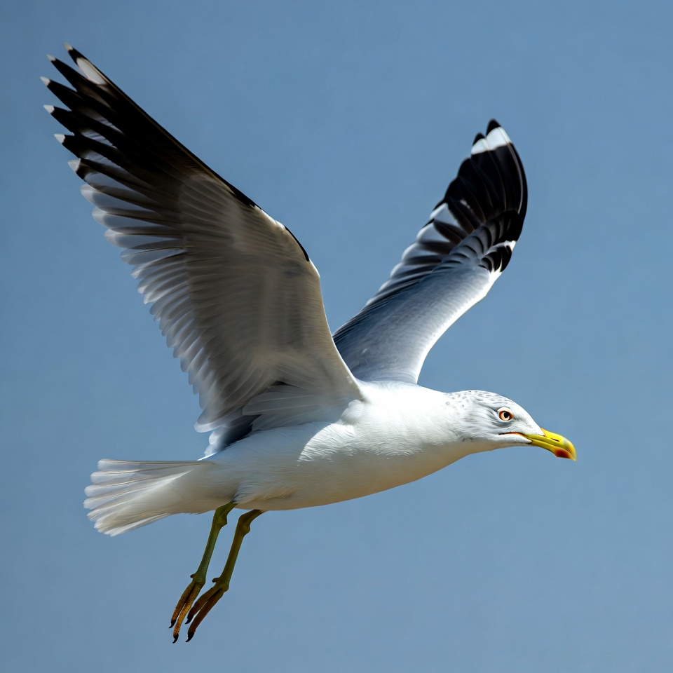 A white gull with black wing tips and yellow beak soars through a clear blue sky. Its wings are fully spread in flight, showcasing detailed feathers. Yellow legs trail behind the bird.