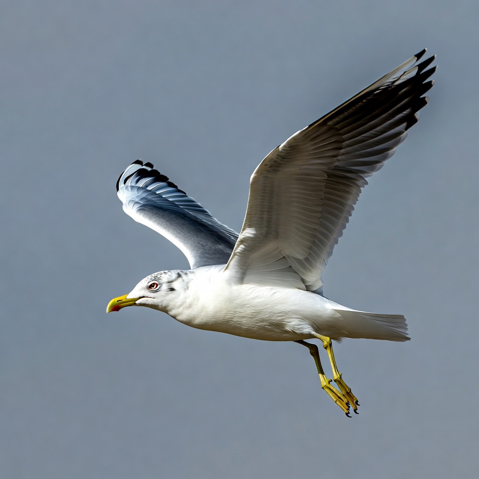 avian, bird, black wingtips, cloudy sky, feathers, flying, gray sky, seagull, soaring bird, white bird, wildlife, wings spread, yellow beak, yellow legs, gull