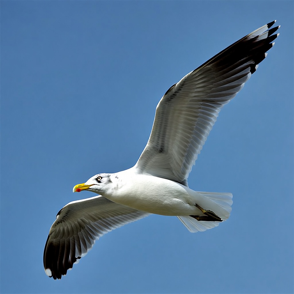 A white seagull with black wingtips and a yellow beak soars through a clear blue sky. Its wings are fully spread in flight, showcasing detailed feathers. The bird faces slightly to the side with a focused expression.
