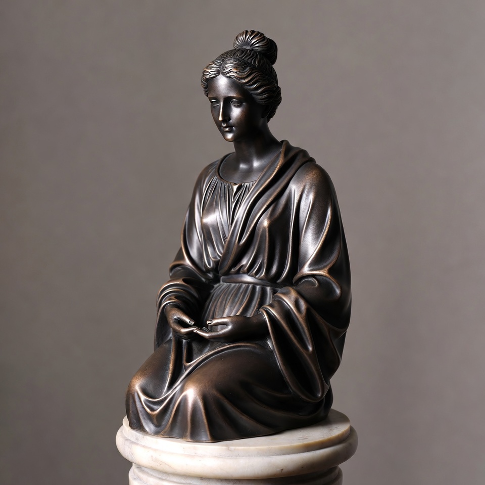 A bronze sculpture depicts a woman seated on a marble pedestal with her hands gently clasped in her lap. She wears flowing draped robes and has her hair styled in an elegant bun. The statue features classical features and is set against a neutral gray background.