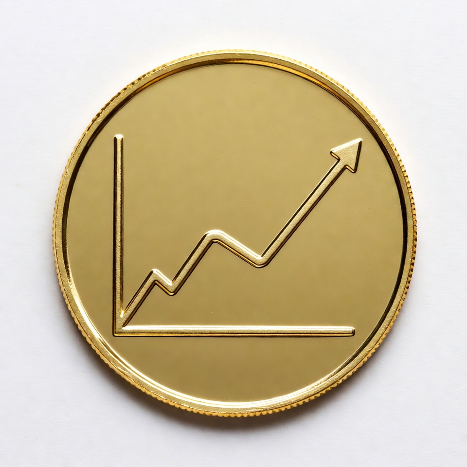 A shiny gold coin features a prominent upward-trending line graph etched on its surface. The graph shows a jagged line rising sharply to the right, symbolizing growth or profit. The coin is centered against a plain white background.