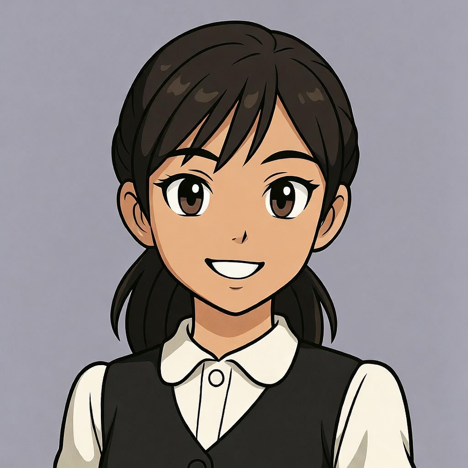 An anime-style illustration of a young Asian girl with short brown hair and large brown eyes smiles happily. She wears a black vest over a white collared shirt. The character stands against a plain light purple background.