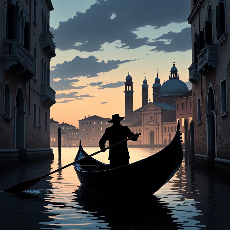 A silhouette of a gondolier in a wide-brimmed hat rows a black gondola through a narrow canal at sunset. Ornate brick buildings and domed churches line the waterway in the background. The sky is filled with clouds in warm orange and blue hues.