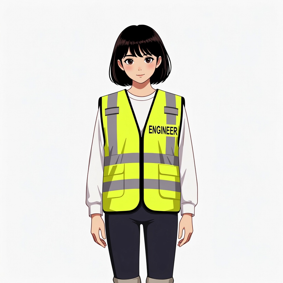 An anime illustration of a young Asian woman with short black hair and large eyes stands smiling on a white background. She wears a bright yellow safety vest labeled 'ENGINEER' over a white long-sleeve shirt and dark pants. Her vest features reflective strips and she has a friendly expression.
