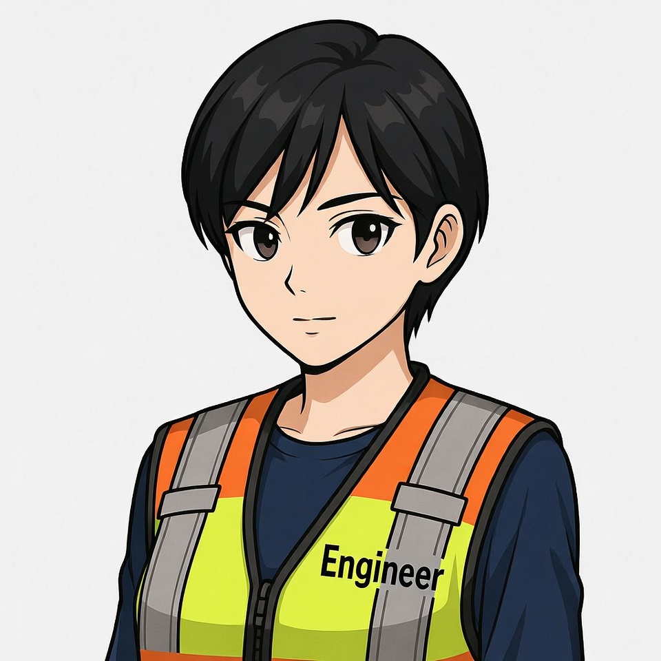 An anime-style illustration of a young Asian woman with short black hair wearing a bright orange safety vest labeled 'Engineer' over a blue shirt. She stands against a transparent background with a neutral expression and large expressive eyes. The vest features reflective yellow and gray stripes.
