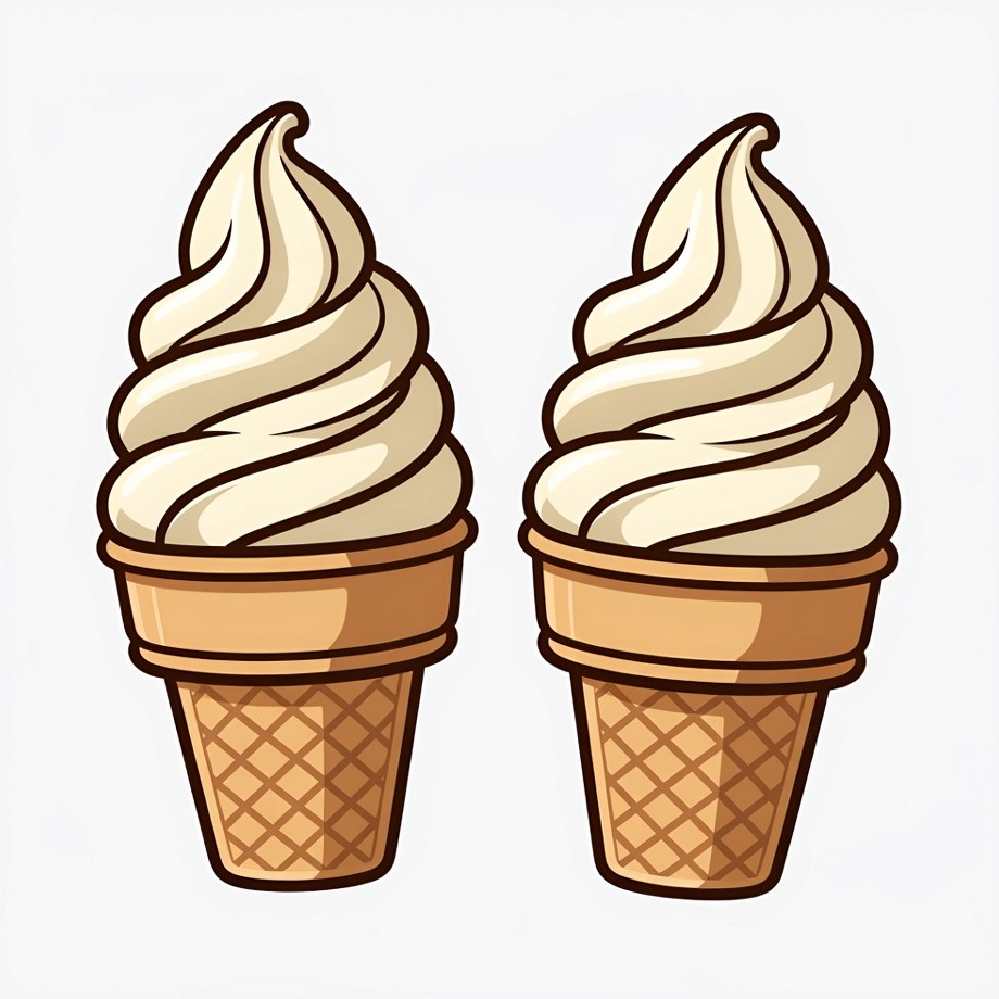 A clipart illustration shows two vanilla soft serve ice cream cones side by side on a white background. Each cone features swirled white ice cream topping a waffle cone with a textured brown surface. The design is simple and cartoonish with clean lines.
