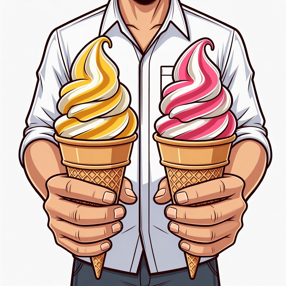 A cartoon man with a beard wears a white shirt and dark pants while holding two waffle cones topped with soft serve ice cream. One cone features yellow vanilla ice cream and the other pink strawberry ice cream. The illustration is on an isolated white background.