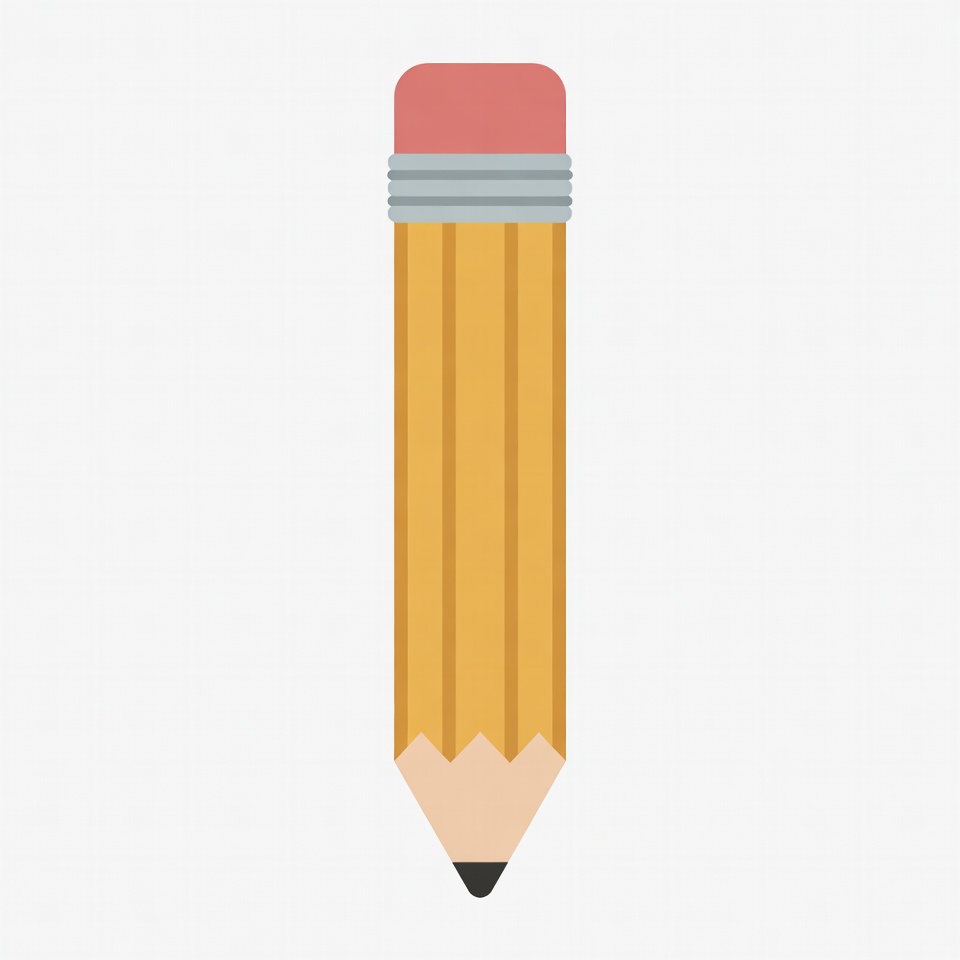 A simple flat illustration of a yellow pencil on a white background. It features a red eraser on top with a silver ferrule and a pointed black tip at the bottom. The pencil has classic hexagonal yellow sides.