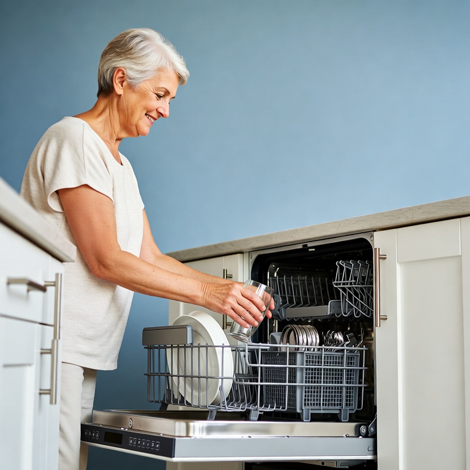 An elderly White woman with short silver hair stands in a kitchen, loading white plates and glasses into an open dishwasher. She wears a light beige short-sleeved top and beige pants, smiling slightly as she handles a plate and glass. The kitchen features white cabinets and a light blue wall behind her.