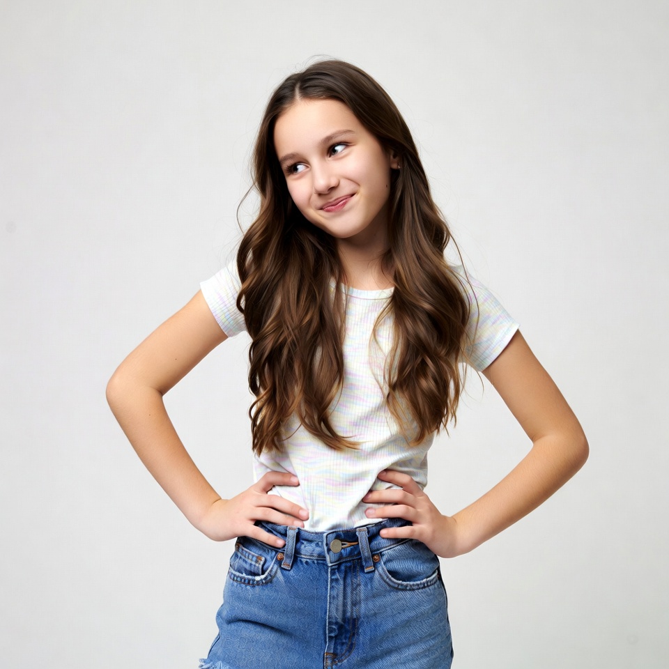 A young girl with long wavy brown hair stands confidently with hands on her hips against a plain white background. She wears a short-sleeved white t-shirt and ripped blue jeans. She tilts her head and smirks playfully at the camera.
