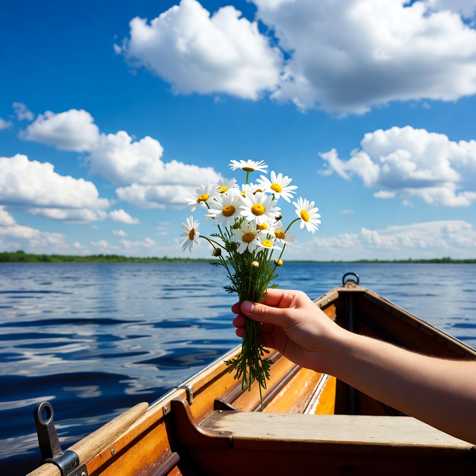 A woman's hand holds a vibrant bouquet of white daisies with yellow centers over the side of a wooden canoe. The canoe floats on a calm blue lake with gentle ripples. A bright blue sky with fluffy white clouds stretches above.