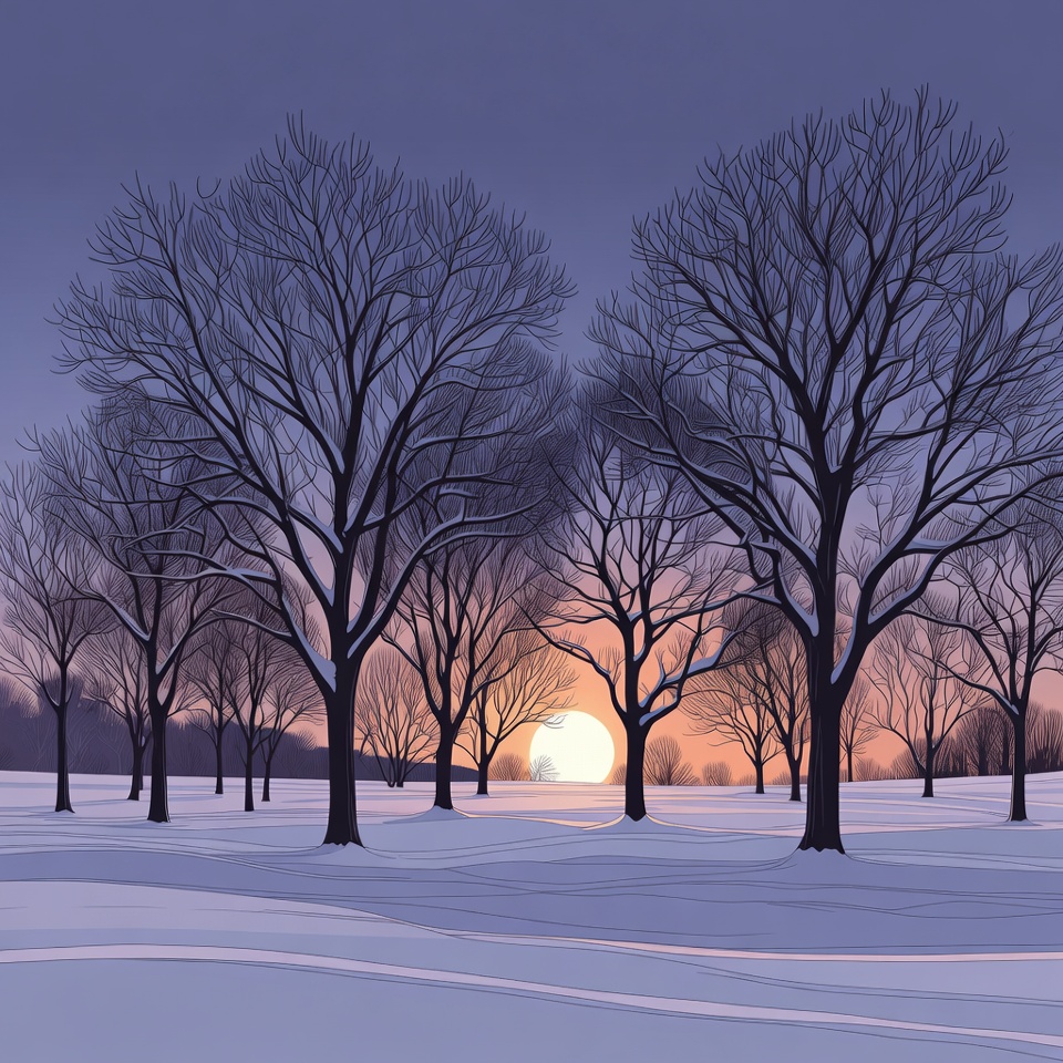 An illustration depicts a cluster of bare trees covered in snow standing in a snowy field. A large orange sun is setting behind the trees under a twilight sky. The scene features smooth vector lines and a serene winter landscape.