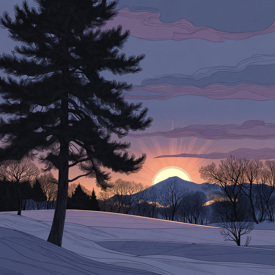 A tall pine tree stands in the foreground of a snowy landscape with rolling hills and bare trees. A vibrant sun sets behind distant purple mountains, casting orange rays across the purple and blue twilight sky. The scene is rendered in a line art illustration style with bold outlines.