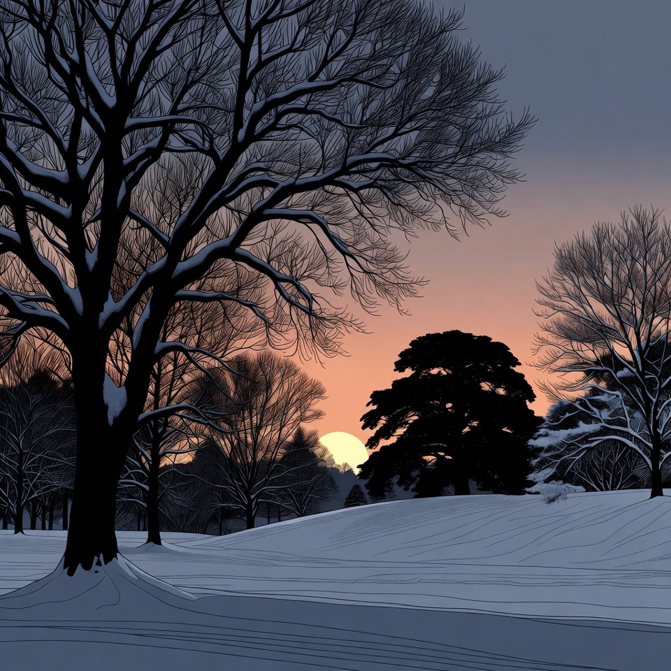 A digital illustration depicts bare trees covered in snow silhouetted against a vibrant sunset sky. A large sun hovers low near the horizon, casting an orange glow over a snowy hill and distant wooded landscape. The scene features intricate line work with dark branches contrasting the pale blue snow.