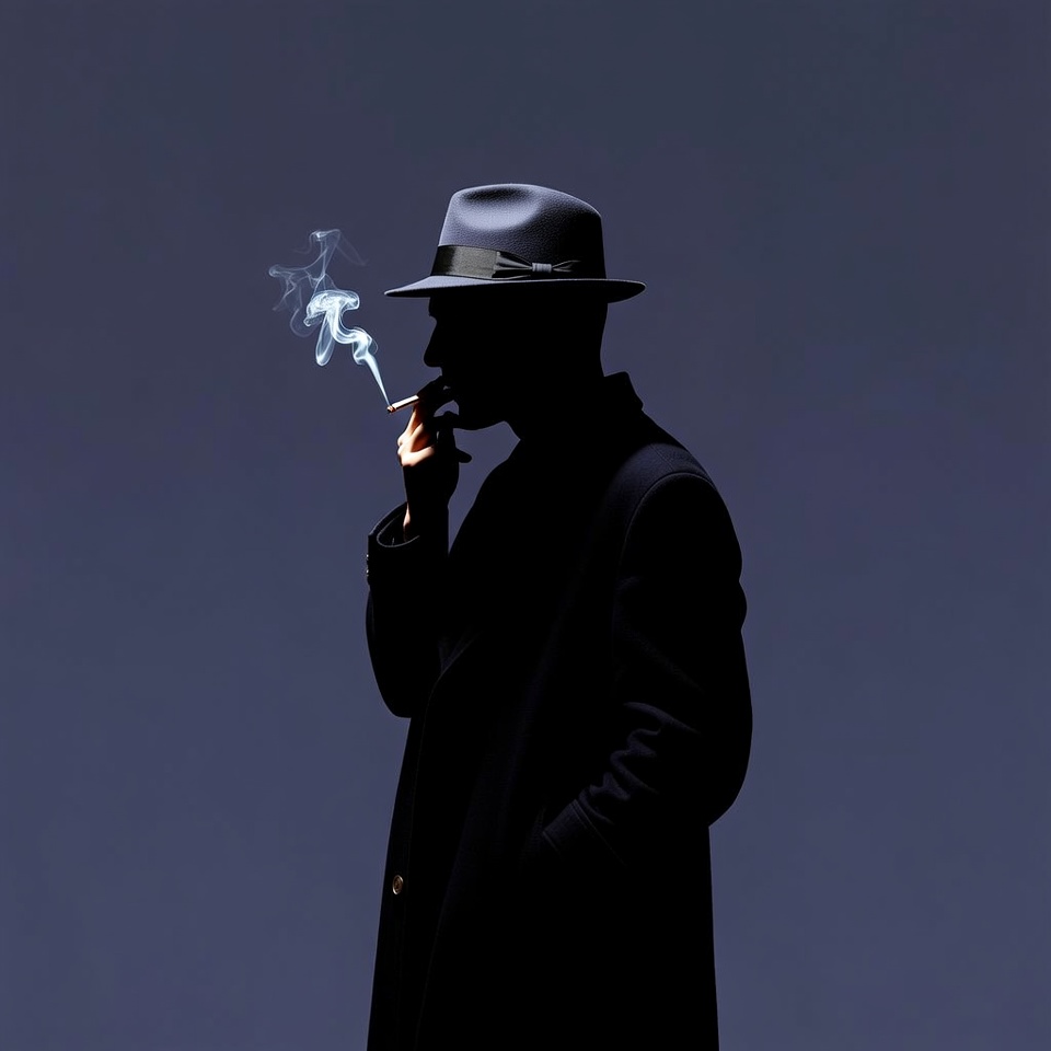 A man in a dark silhouette profile wears a gray fedora hat and long black coat. He holds a lit cigarette to his mouth with smoke rising upward against a deep blue background. His face is shadowed, emphasizing the noir style pose.