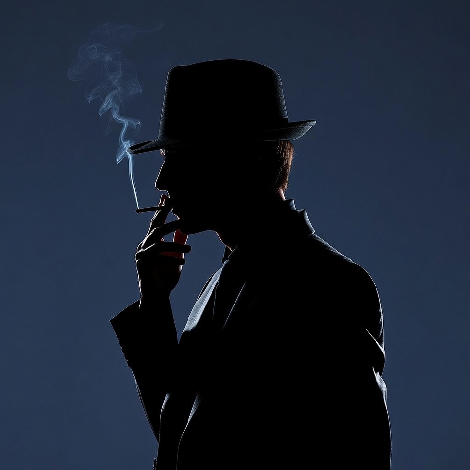 A silhouette of a man in profile holds a lit cigarette to his lips, with smoke curling upward. He wears a black fedora hat and a suit jacket on a dark blue background. The image is a high-contrast black shadow against the gradient backdrop.