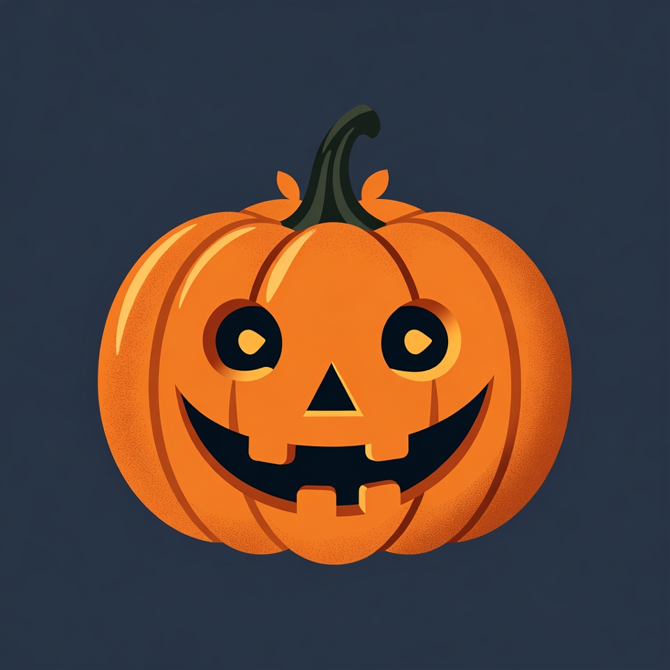 A cheerful orange jack-o'-lantern pumpkin with carved triangular eyes, nose, and jagged smiling mouth sits on a dark blue background. The pumpkin has a green stem and leaf on top. It is a vibrant digital illustration with smooth shading.