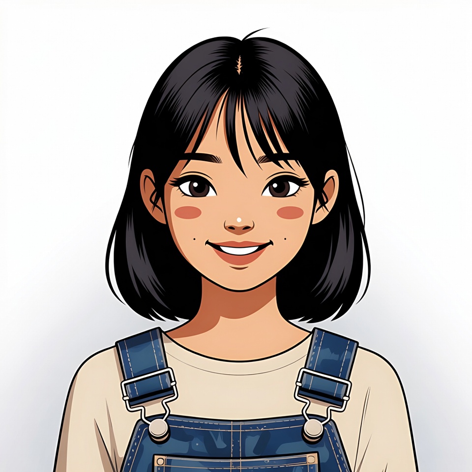 Asian, black hair, cartoon, cute, denim overalls, female, happy expression, illustration, isolated background, large eyes, manga style, portrait, rosy cheeks, short hair, smiling, white shirt, young woman, anime girl