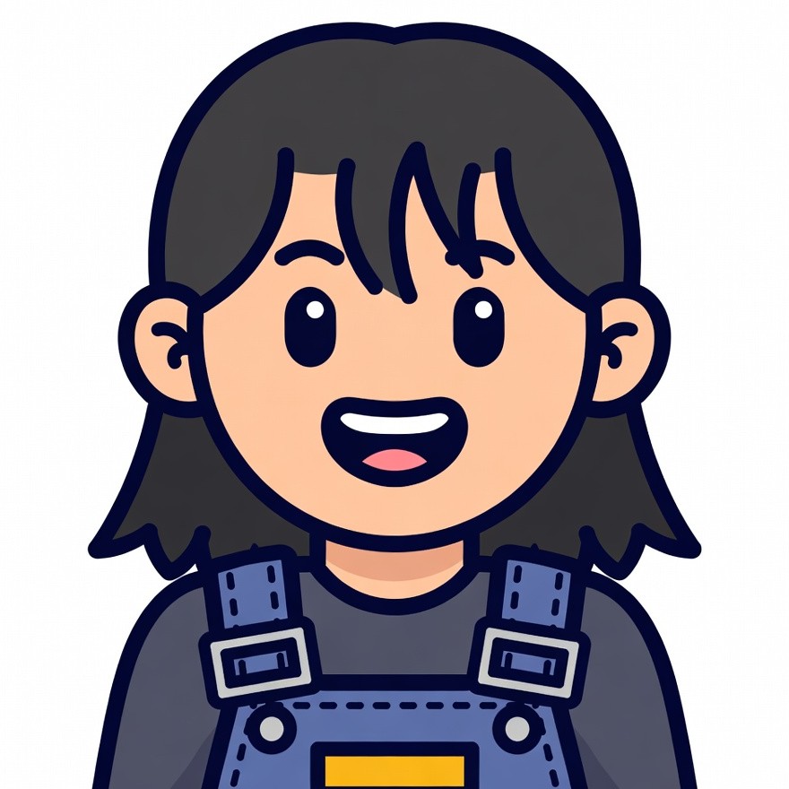Asian, anime style, big eyes, black hair, blue overalls, cartoon, character, cheerful, clipart, cute, denim overalls, drawing, female, happy, illustration, isolated background, kawaii, long hair, portrait, simple background, smiling, vector art, wide smile, yellow straps, girl