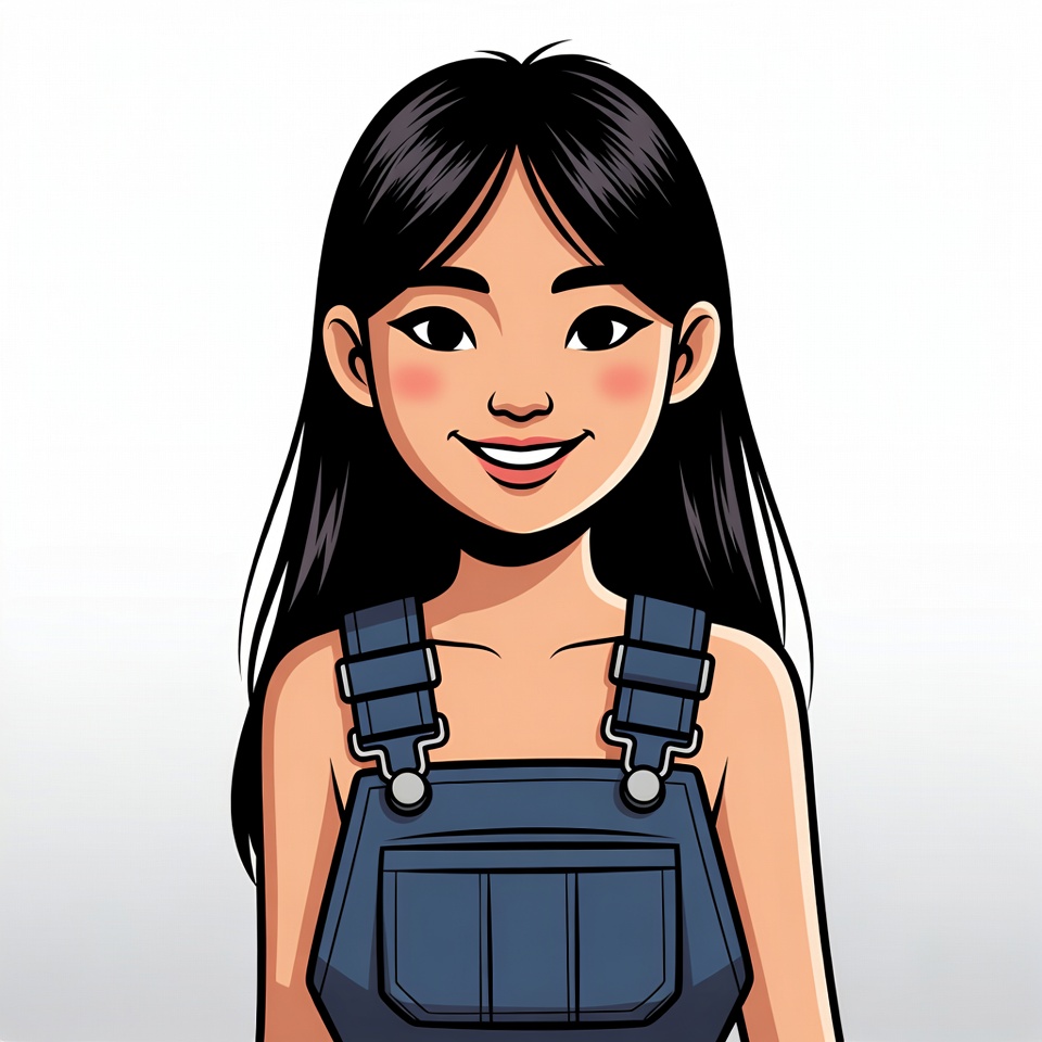 Asian, anime style, blue overalls, cartoon, clipart, cute girl, denim overalls, female, girl, happy face, illustration, isolated background, long black hair, portrait, smiling, straps, vector art, young woman, Asian girl
