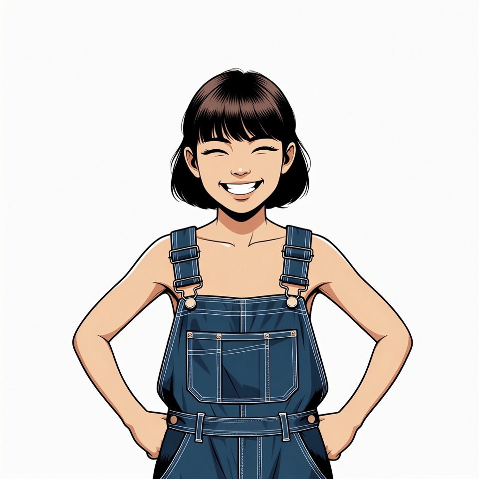 A cartoon Asian girl with short black bob hair stands smiling happily on a white background. She wears blue denim overalls with straps over her bare shoulders and hands on hips. Her eyes are squinted in joy with a wide grin.